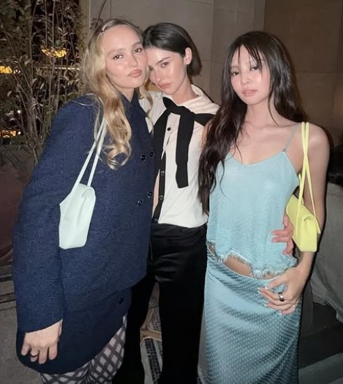 在SNS发布的照片中,还可以看到Jennie与Lily-Rose Depp、Gracie Abrams并肩站立的画面。这展现了Jennie的全球人脉,自由姿态的快照生动传达了巴黎秀场外的夜晚。