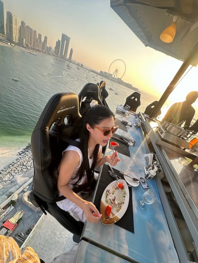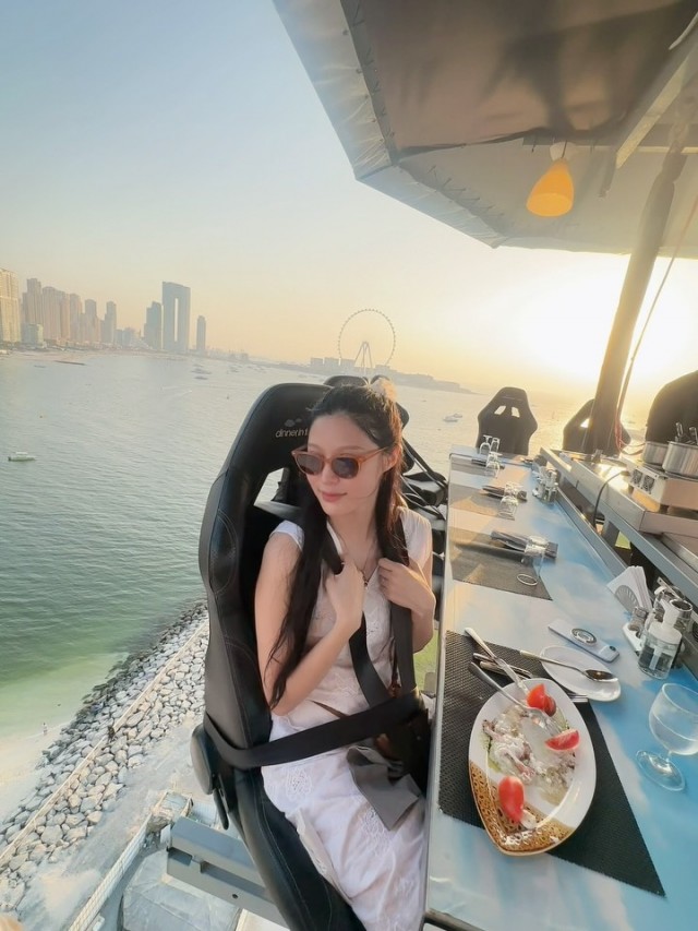 赵敏最近在自己的社交媒体上发布了多张照片,并配文道:"悬空吃饭✈️,虽然刺激但非常有趣✨"。公开的照片中,赵敏身穿白色连衣裙,戴着太阳镜,坐在悬挂在空中的座椅上用餐,背景是迪拜海岸线美丽的城市天际线。在日落时分浪漫的氛围中,她手持盘子和饮料,目视前方,给人一种专注于这次独特体验的印象。