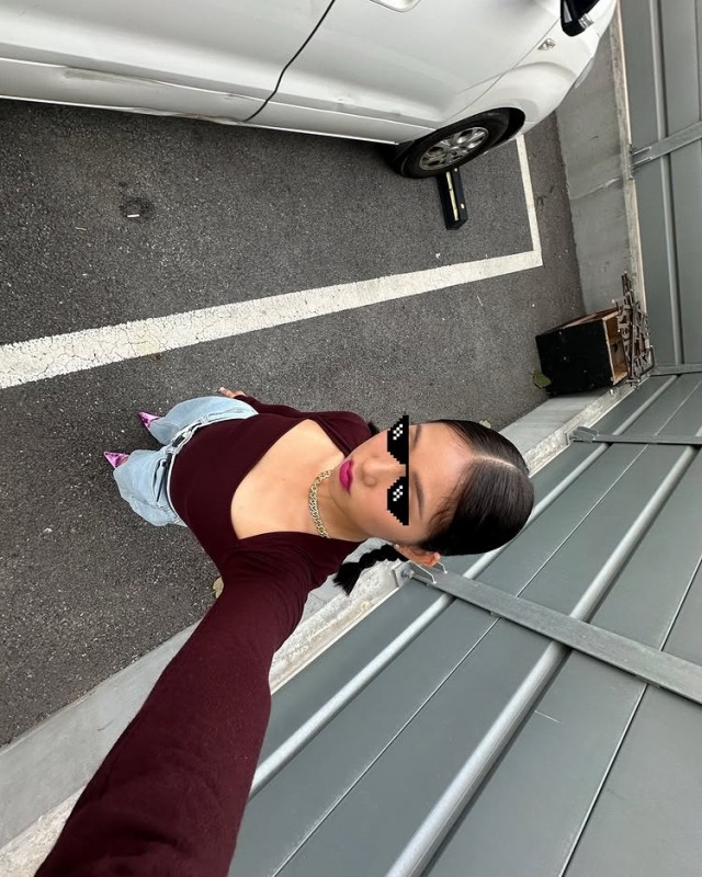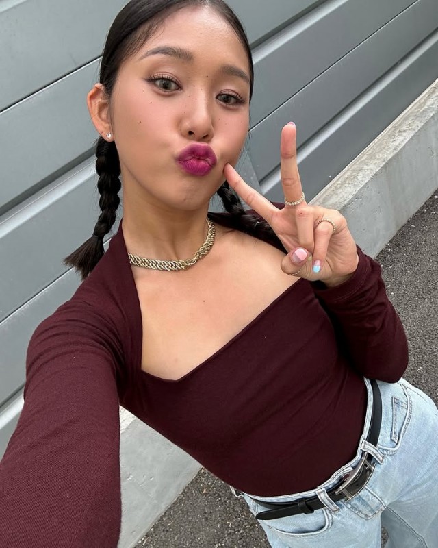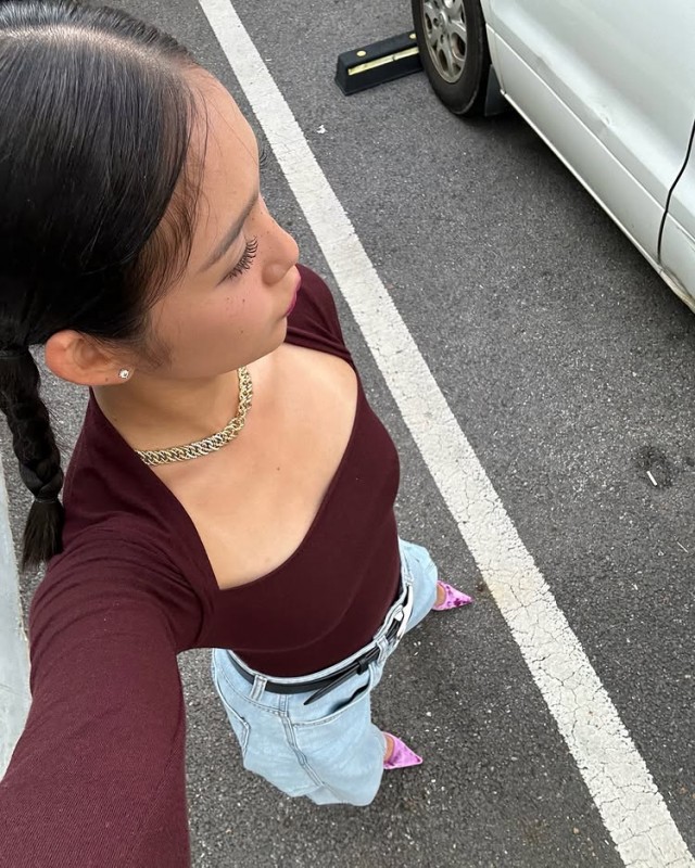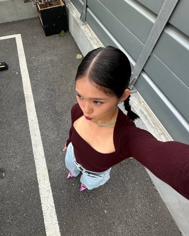 Mimi最近在自己的SNS上发布了多张自拍照,搭配了酒红色长袖T恤和牛仔裤的造型。在以停车场为背景的照片中,她闭嘴直视前方,或一手比V字手势微笑,展现了丰富多样的表情。粉色鞋子和链条项链作为点缀的干净休闲装引人注目。