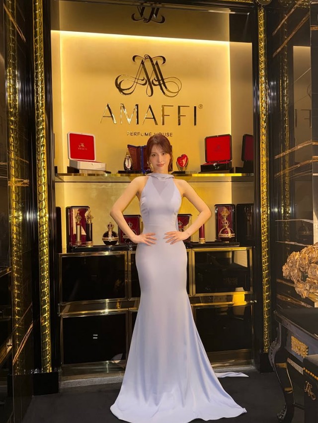特别是金色灯光和陈列着各种香水瓶的背景与Momo的形象相得益彰,使得时尚造型更加突出。在手持香槟杯的照片中,以高级空间感为背景,进一步提升了品味魅力。