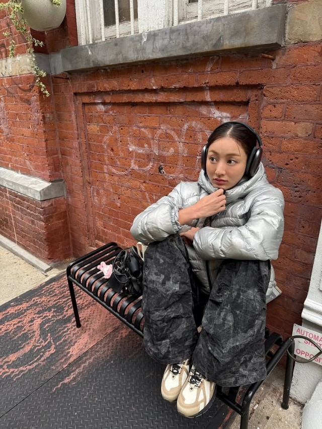 志效身穿银色羽绒服搭配黑色裤子,展现出沉稳的冬季造型,坐在长椅上,在寒风中依然露出悠闲的表情。背景是红砖建筑和涂鸦交织的都市景象,营造出都市氛围。她戴着耳机,手握咖啡杯,仿佛用温暖的饮品驱散寒冷,展现出日常的温馨瞬间。