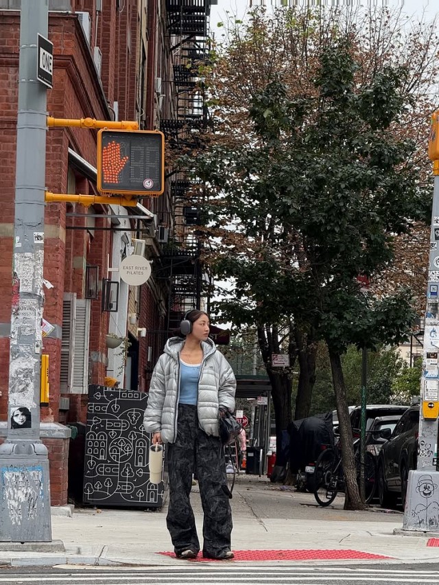 另一张照片中,她穿着蓝色上衣和银色轻便羽绒服,在楼梯和镜子前摆出各种姿势,完成了时尚的冬季穿搭。特别是手拿披萨灿烂微笑自拍的画面,流露出平凡生活中的幸福感。