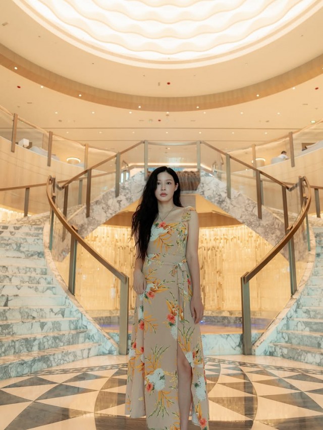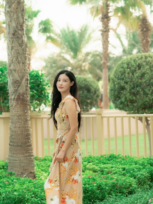 网红赵敏最近在阿布扎比的一家度假酒店被拍到的近况公开了。赵敏穿着花卉连衣裙,在满是棕榈树和翠绿植被的户外空间,自然地摆出各种姿势进行拍照。从一只脚向前迈出、正面凝视的样子,到以楼梯下优雅的室内空间为背景展现的高贵氛围,展现了多样的魅力。