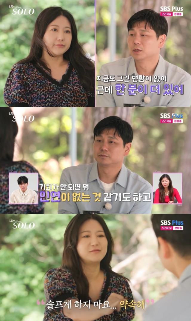 正淑对英秀表达了失望。22日播出的SBS Plus、ENA综艺节目《我是 SOLO》中,正淑表现出对与英秀关系的烦恼。正淑问玉顺:"你知道昨天贤淑和英秀发生了什么事吗?"玉顺回答:"贤淑姐姐在多对一约会中努力表现,英秀也很好地接受了。"听到这话,正淑表示"不太高兴",表达了不满。