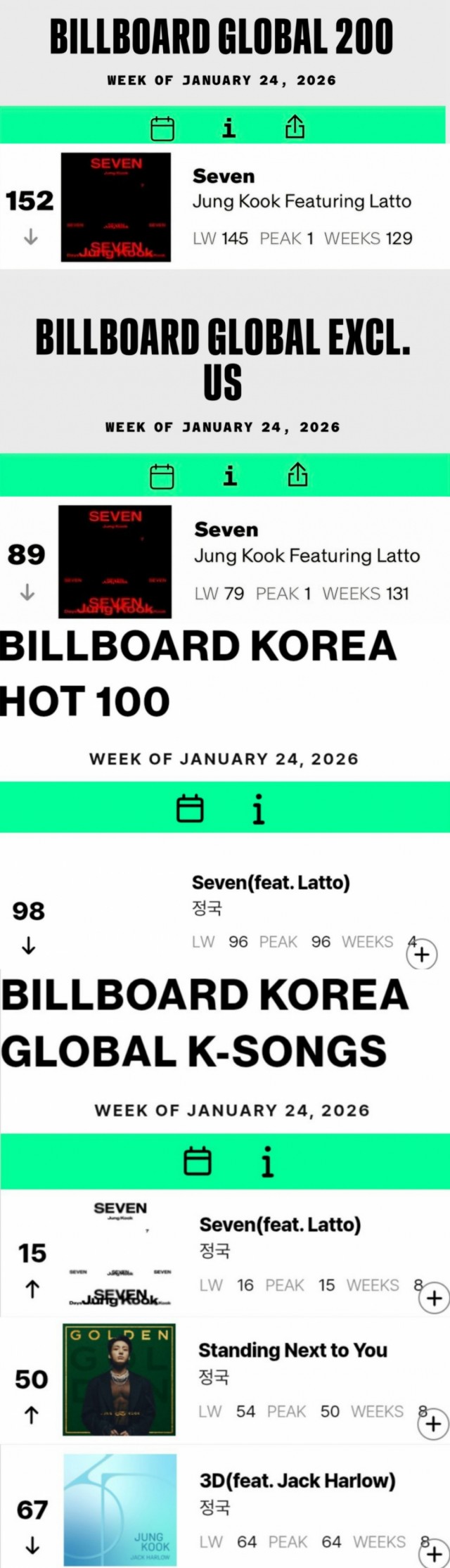在Billboard"Global K-Songs"排行榜中,《Seven》排名第15位,《Standing Next to You》排名第50位,《3D》排名第67位,三首歌曲均连续第8周入榜。《Seven》自2023年7月发行后,在Billboard"Global (除美国)"排行榜连续9周夺冠,在"Global 200"排行榜连续7周夺冠。在这两个排行榜上,作为亚洲歌手首次且最长时间连续7周同时夺冠,取得了辉煌成绩。