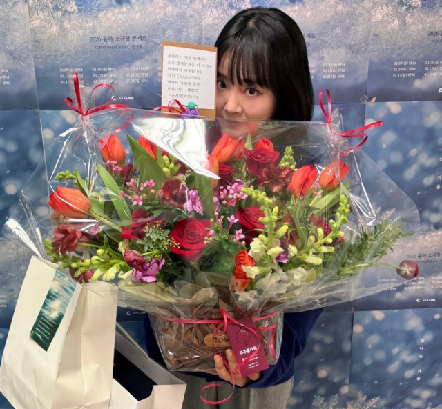 照片中的尹哈在正在进行的小剧场演唱会"闪耀的冬天"现场,手捧Karina送来的大型花束和购物袋,脸上洋溢着幸福的表情。花束上写着"在名为尹哈的星星闪耀的今天,'闪耀的冬天'能与你同在感到幸福。祝贺SUB CHARACTER发行并送上国哈的应援。瑜加内(智敏)敬上"的信息,展现了两人亲密的关系。
