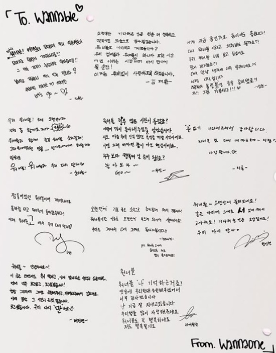 组合WANNA ONE在重聚前向粉丝们传达了信息。1日,WANNA ONE官方账号上传了一张包含11名成员向粉丝传递信息的图片。成员们留下了各自个性化的问候语,如"虽然迟到了,但来兑现承诺了"、"现在才刚开始"、"WANNABLE再次存入我心中"等。