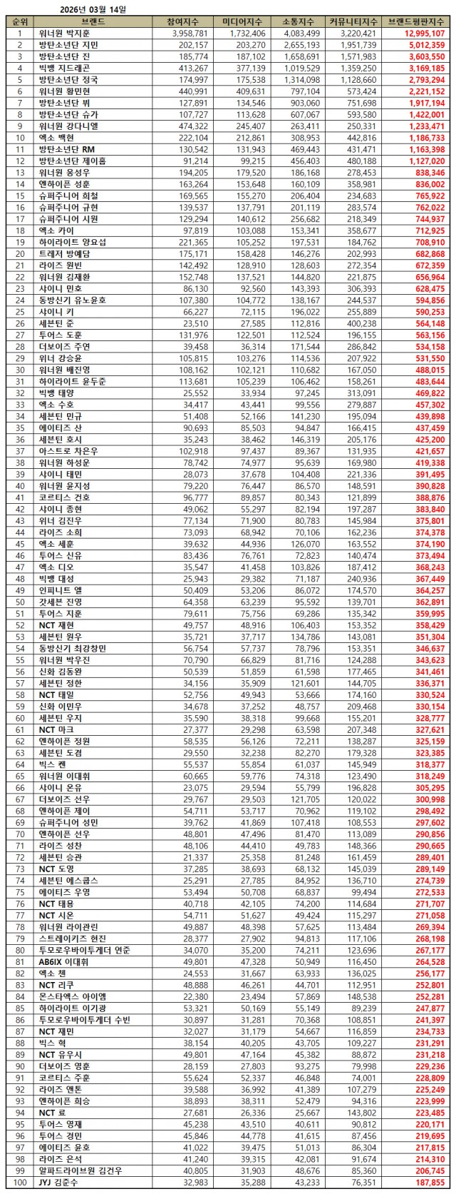 2026年3月男团个人品牌声誉前100名包括:朴志训、智旻、珍、权志龙、郑国、黄旼炫、V、SUGA、姜丹尼尔、伯贤、金南俊、J-Hope、翁成宇、成勋(Enhypen)、熙哲(Super Junior)、圭贤(Super Junior)、始源(Super Junior)、Kai(EXO)、梁耀燮(HIGHLIGHT)、方艺潭(TREASURE)、元彬(RIIZE)、金在焕(WANNA ONE)、珉豪(SHINee)、允浩(东方神起)、Key(SHINee)、俊(Seventeen)、都勋(TWS)、柱延(THE BOYZ)、姜胜允(WINNER)、裴珍映(WANNA ONE)、尹斗俊(HIGHLIGHT)、太阳(BIGBANG)、秀珉(EXO)、珉圭(Seventeen)、San(ATEEZ)、Hoshi(Seventeen)、车银优(Astro)、河成云(WANNA ONE)、泰民(SHINee)、尹智圣(WANNA ONE)、建浩(CORTIS)、钟铉(SHINee)、金珍雨(WINNER)、素熙(RIIZE)、世勋(EXO)、申佑(TWS)、D.O.(EXO)、大成(BIGBANG)、L(INFINITE)、镇荣(GOT7)、志勋(TWS)、在玹(NCT)、元宇(Seventeen)、崔强昌珉(东方神起)、朴佑镇(WANNA ONE)、金东完(SHINHWA)、郑汉(Seventeen)、泰一(NCT)、李敏雨(SHINHWA)、宇志(Seventeen)、马克(NCT)、郑元(Enhypen)、度兼(Seventeen)、Ken(VIXX)、李大辉(WANNA ONE)、温流(SHINee)、善宇(THE BOYZ)、J(Enhypen)、成民(Super Junior)、善宇(Enhypen)、成灿(RIIZE)、胜官(Seventeen)、度英(NCT)、S.COUPS(Seventeen)、宇荣(ATEEZ)、泰容(NCT)、始源(NCT)、赖冠霖(WANNA ONE)、贤辰(Stray Kids)、延俊(Tomorrow X Together (TXT))、李大辉(AB6IX)、Chen(EXO)、利久(NCT)、I.M(Monsta X)、李起光(HIGHLIGHT)、秀彬(Tomorrow X Together (TXT))、在玟(NCT)、赫(VIXX)、有栖(NCT)、英勋(THE BOYZ)、柱勋(CORTIS)、Anton(RIIZE)、熙承(Enhypen)、Ryō(NCT)、英宰(TWS)、景民(TWS)、允浩(ATEEZ)、银锡(RIIZE)、金建宇(AlphaDriveOne)、金俊秀(JYJ)等。